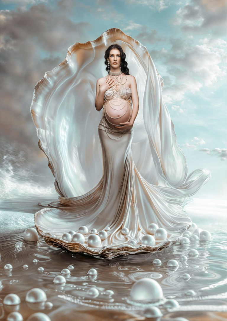 Pour ce shooting grossesse, j’ai imaginé une image forte et symbolique, où je mets en scène la future maman comme une figure précieuse et intemporelle. Je me suis inspirée de l’univers de la perle et du coquillage pour évoquer la protection, la naissance et la beauté rare qui se forme avec patience. À travers la lumière douce, les tons nacrés et les textures fluides, je cherche toujours à sublimer les courbes naturelles avec élégance et respect.